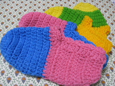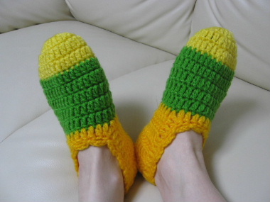 毛糸で編んだ、手作りのふわふわ足カバーでっす